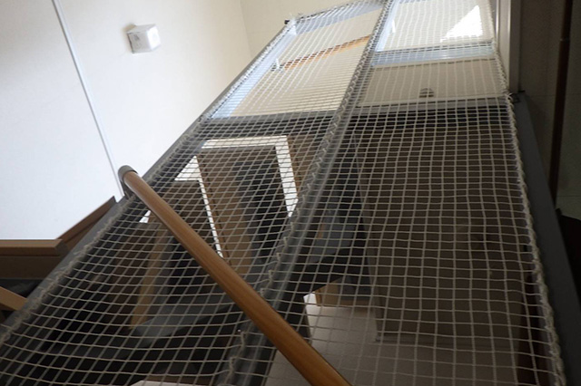 施設や建物内外で人や物が誤って落下する恐れがある場所に落下防止のネットを施工します。既設の安全柵と併用することで人の命を守ります。